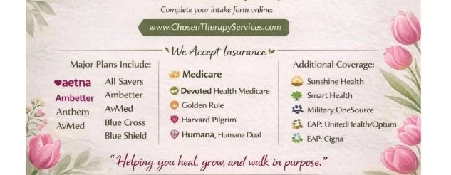 At Chosen Therapy Services, our therapy sessions are 50-minutes in length Our services are covered by most insurance providers under “Psychological Services.”
